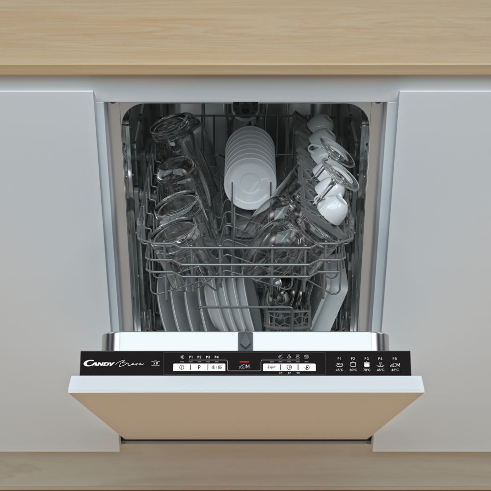Candy Brava CDIH 1L949. Posizionamento dell'apparecchio: A scomparsa totale, Dimensione: Compatta (45 cm), Colore pannello di controllo: Nero. Numero di coperti: 9 coperti, Classe emissione rumore: C, Emissione acustica: 49 dB. Classe efficienza energetica: F, Consumo di acqua per ciclo: 9 L, Consumo energetico per 100 cicli: 78 kWh. Larghezza: 448 mm, Profondità: 559 mm, Altezza: 816 mm. Larghezz... Mostra tutto