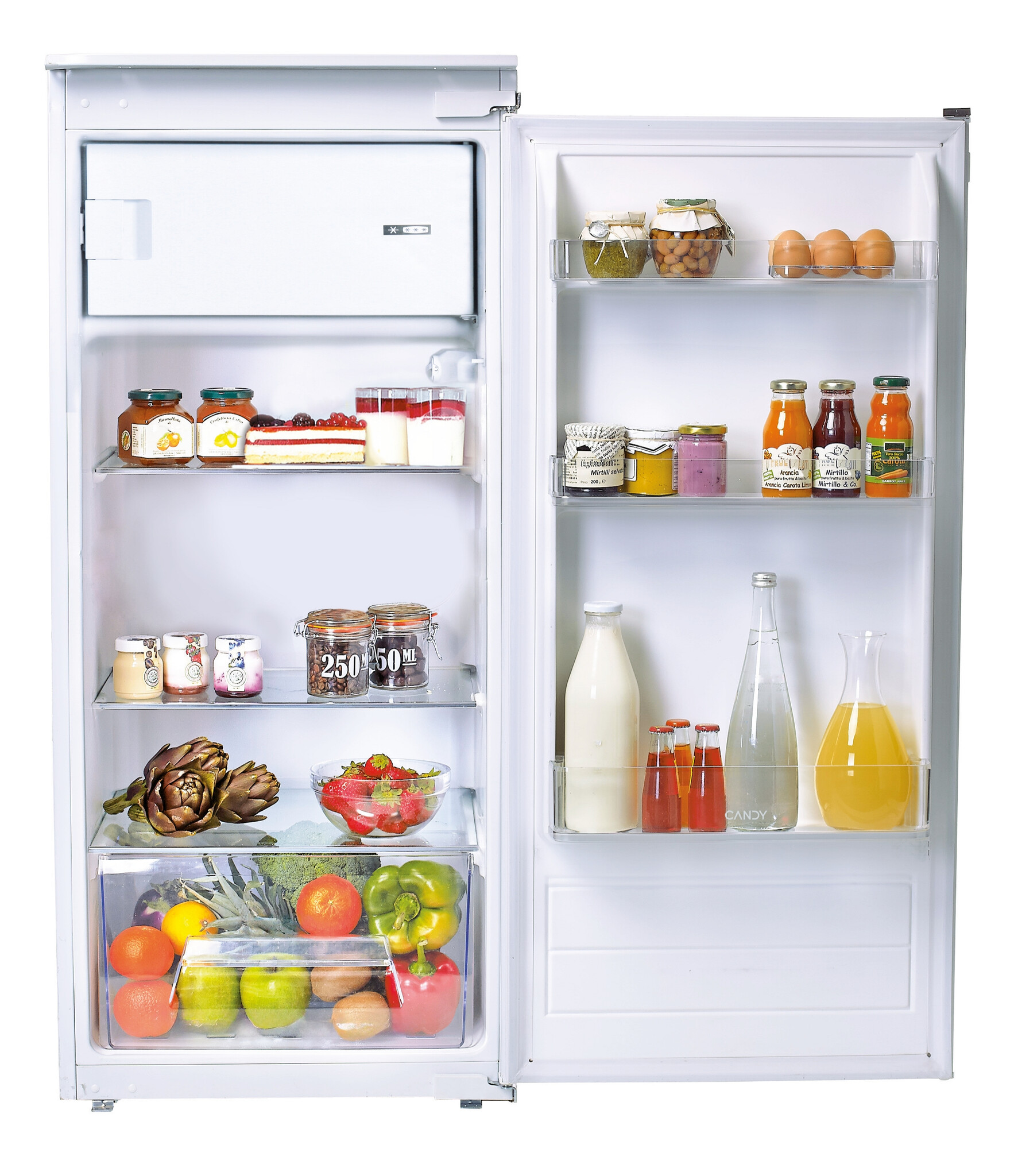Candy CIO 225 EE/N. Capacità netta totale: 179 L. Cerniera porta: Destra. Classe climatica: N-ST, Emissione acustica: 39 dB. Capacità netta frigorifero: 163 L, Numero di ripiani frigorifero: 3, Numero di cassetti per verdura: 1. Capacità netta congelatore: 16 L, Capacità di congelamento: 2,6 kg/24h. Classe efficienza energetica: E, Consumo energetico annuo: 148 kWh. Colore del prodotto: Bianco