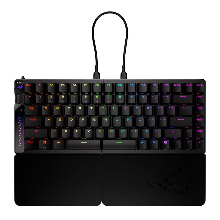 ASUS ROG Falcata. Fattore di forma tastiera: 75%. Stile tastiera: Dritto. Tecnologia di connessione: Con cavo e senza cavo, Interfaccia dispositivo: USB + RF Wireless + Bluetooth, Interruttore a chiave per tastiera: Magnetic-mechanical key switch. Tipologia di retroilluminazione: LED RGB, Riposo del polso. Utilizzo raccomandato: Gaming. Colore del prodotto: Nero
