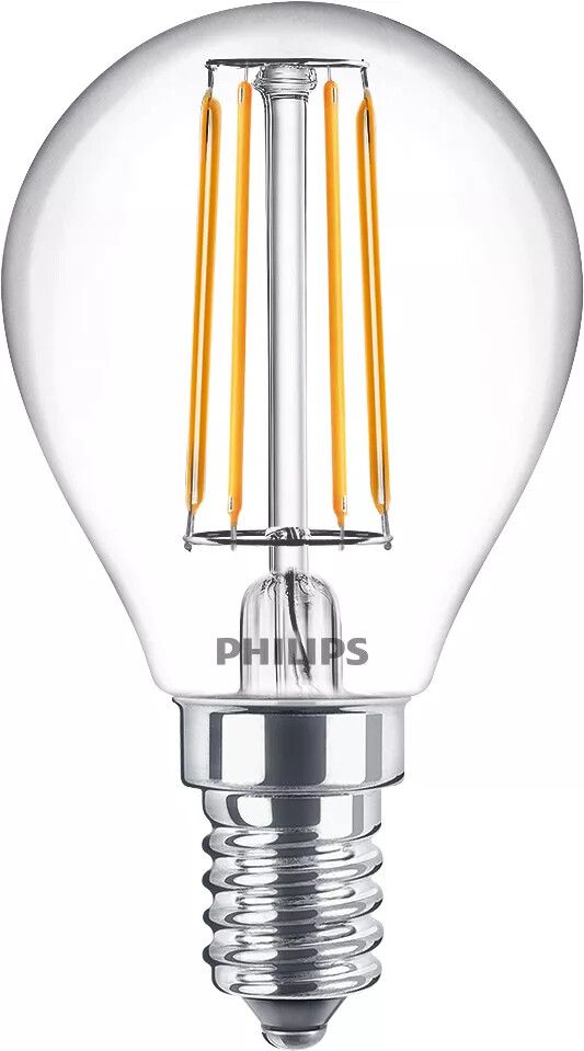 Philips Lampadina candela trasparente a filamento 40 W P45 E14. Potenza lampadina: 4,3 W, Lampadina di potenza equivalente: 40 W, Attacco lampada: E14, Flusso luminoso: 470 lm, Durata della lampadina: 15000 h, Colore della luce: Bianco caldo, Temperatura colore: 2700 K, Color Rendering Index (CRI): 80, Fattore di potenza: 0,41