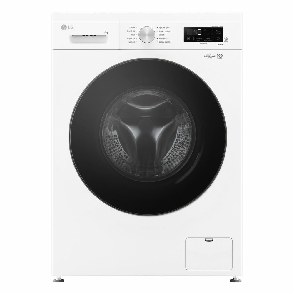LG F4NX1009NWB Lavatrice smart 9kg, Classe A, 1400 giri, 6 Motion, Allergy Care, Bianca. Tipo di carica: Caricamento frontale. Capacità cestello: 9 kg, Classe di efficienza della centrifuga: B, Silenziosità (centrifuga): 75 dB, Velocità di centrifuga massima: 1400 Giri/min. Colore del prodotto: Bianco. Larghezza: 600 mm, Profondità: 550 mm, Altezza: 850 mm. Classe efficienza energetica: A