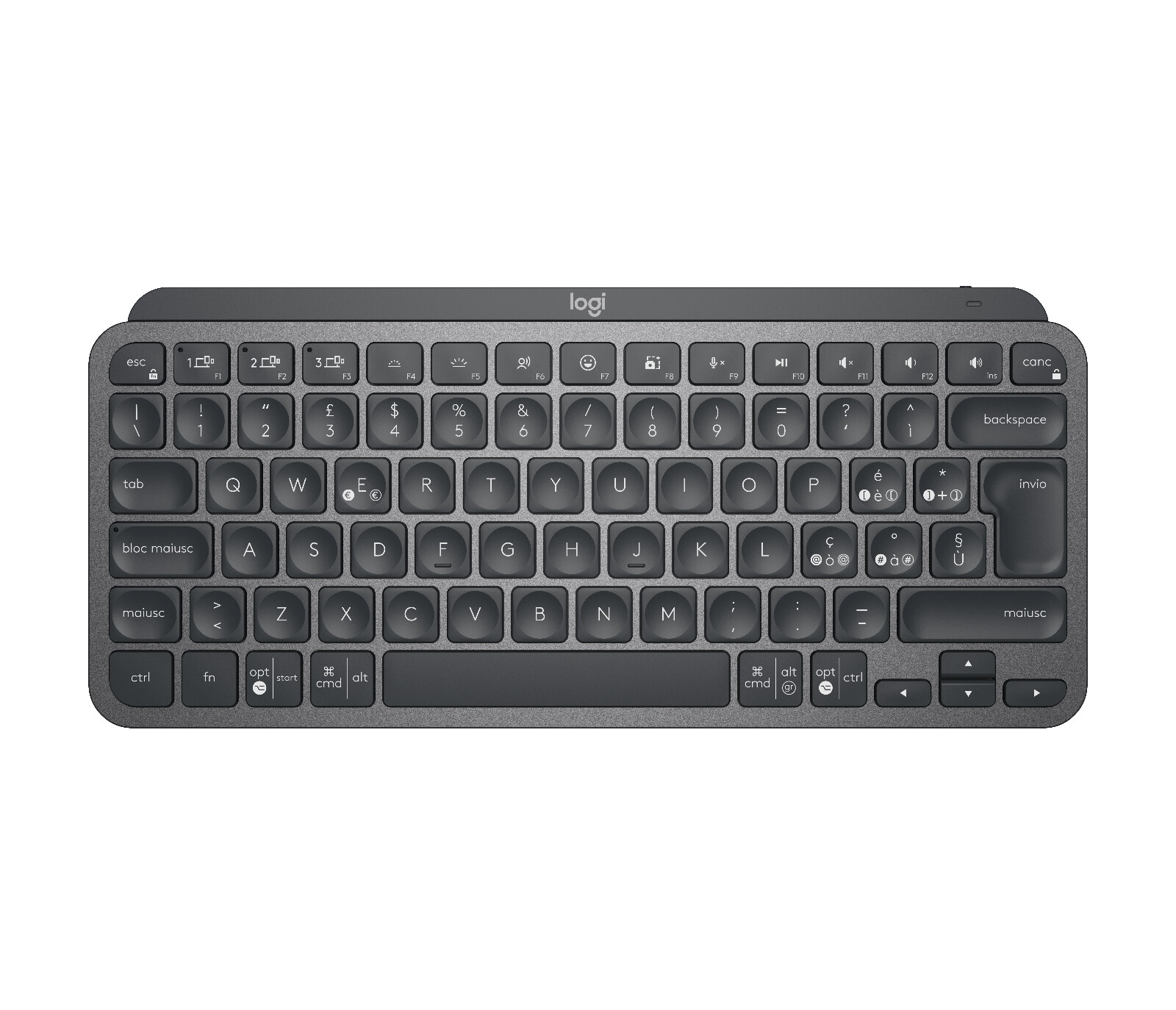 Logitech MX Keys Mini. Fattore di forma tastiera: Mini. Stile tastiera: Dritto. Tecnologia di connessione: Wireless, Interfaccia dispositivo: RF senza fili + Bluetooth, Struttura tastiera: QWERTY. Tipologia di retroilluminazione: LED. Utilizzo raccomandato: Ufficio. Colore del prodotto: Grafite